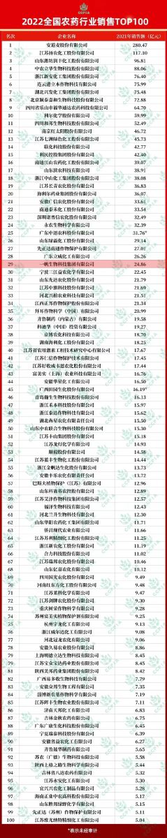 附2022全國(guó)農(nóng)藥行業(yè)銷售TOP100完整表單如下: