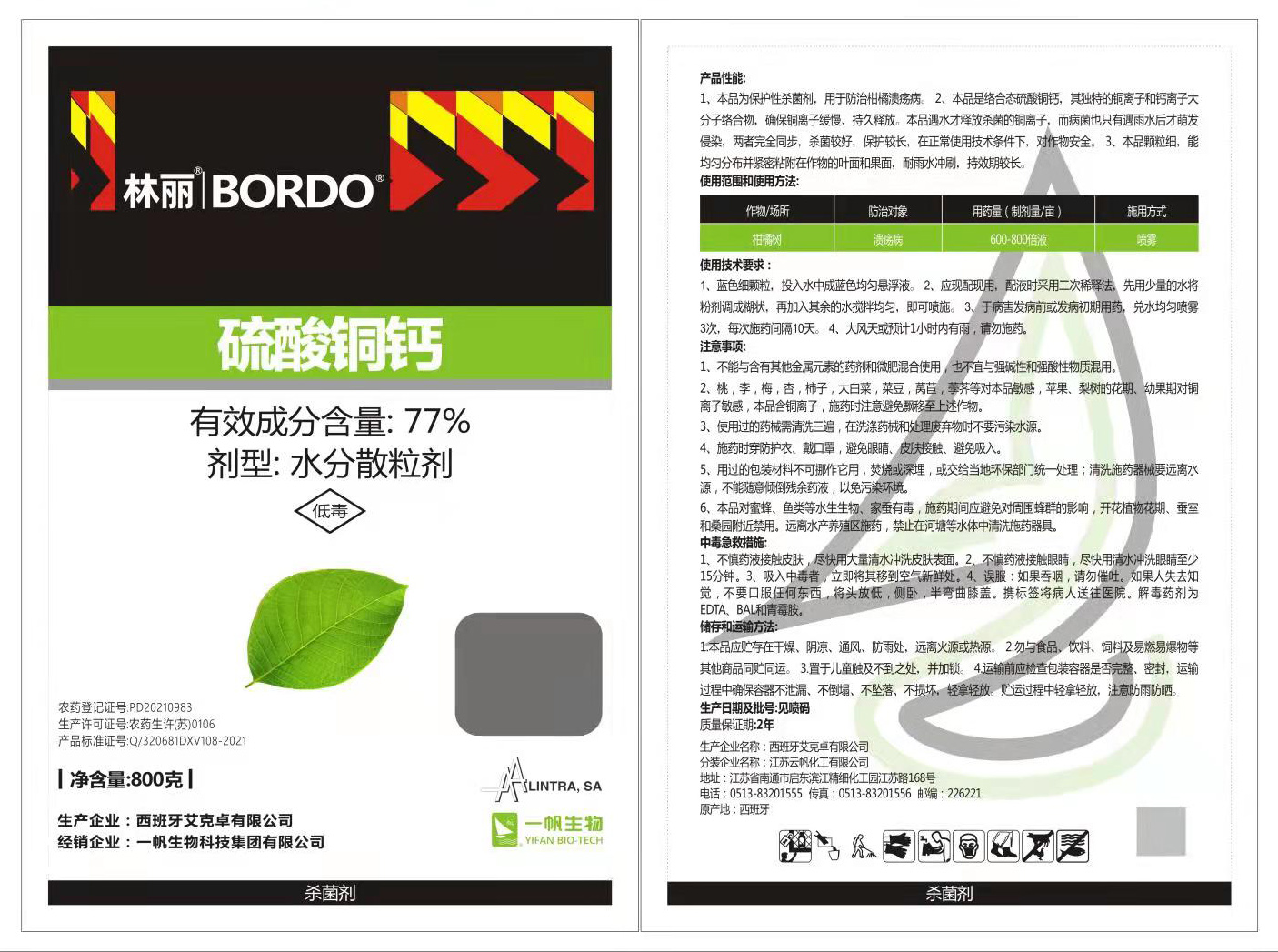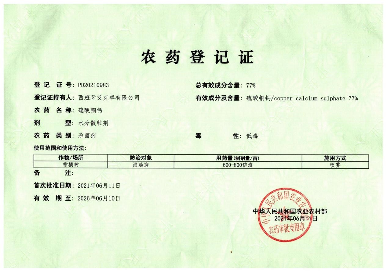 Under the guidance of the development strategy of "combining going out and bringing in", Yifan Biotechnology Group and Alintra from Spain began to discuss the plan to introduce the excellent foreign fungicide Bordo in 2018. The two parties signed a strategic cooperation agreement in 2019, and get the registration certificate in June 2021. Bordo is an excellent plant protection product, produced by Alintra, with high reputation in Europe and the United States. It belongs to the inorganic copper protective fungicide. It has the advantages of wide bactericidal spectrum, long lasting effect, and not easy to produce resistance. Yifan has conducted extensive field trials on its new product Bordo in citrus growing areas such as Guangxi, Yunnan and Hunan since 2018. The test shows that the product has an excellent control effect on citrus canker and other diseases, which has been unanimously recognized by users. At the same time, Bordo also has a good control effect on root diseases. It can effectively prevent various bacterial and fungal diseases when used in root irrigation treatment.